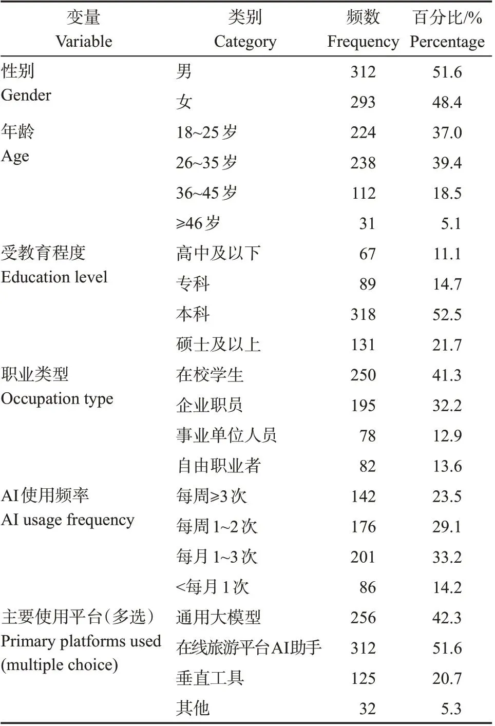 如表1所示,最终样本(N=605)覆盖18~46岁主要旅行群体,其中,18~35岁用户占比76.4%,本科及以上学历者占74.2%,与行业报告中的AI旅行用户主体特征一致(年龄偏差<3%,学历偏差<2%)。学生群体占比41.3%,在职人员占比58.7%,符合抽样设计要求。在AI使用行为方面,每周使用≥1次的高频用户占52.6%,主要依赖在线旅游平台AI 助手(51.6%)和通用大模型(42.3%)。