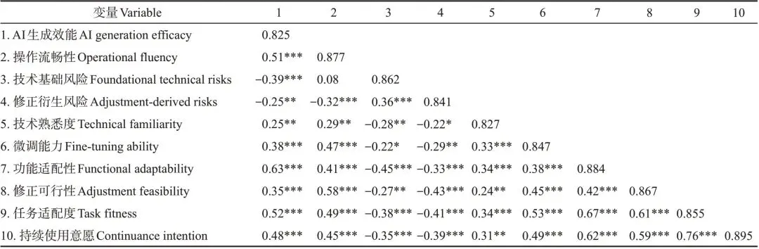 注:对角线数字为各变量AVE的平方根,非对角线为变量间相关系数(*p<0.05,**p<0.01,***p<0.001)。