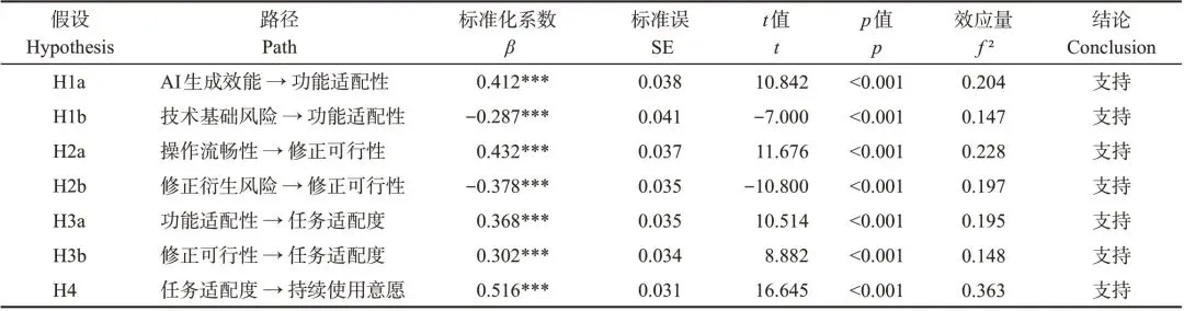 功能适配性(β = 0.368,p < 0.001)与修正可行性(β=0.302,p<0.001)均显著正向影响任务适配度,支持H3a 与H3b;功能适配性贡献度更高(f²=0.195>0.148),表明技术输出质量比操作修正效率对任务匹配更重要。