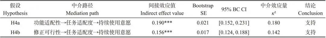 为验证任务适配度在功能适配性与持续使用意愿之间(H4a)及修正可行性与持续使用意愿之间(H4b)的中介作用,采用偏差校正Bootstrap法(5000次抽样)进行检验。表7 显示了间接效应值、Bootstrap 标准误、95%偏差校正置信区间(Bias-Corrected CI)及效应量(κ²)。结果如下。