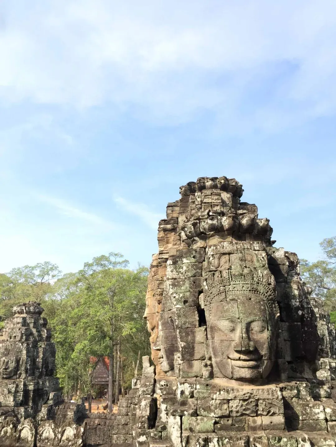 📍巴戎寺--高棉的微笑 Bayon 巴戎寺就是著名的「高棉的微笑」所在地,共有54座巨塔,每座塔顶都雕刻着四尊佛像,四面佛头顶莲花,四个面分别代表慈、悲、喜、舍。大佛像是依据阇耶跋摩七世的面孔雕刻的,他给这片战火连连的国度留下了微笑的信仰。 📍塔布隆寺 Ta Prohm 塔布隆寺是阇耶跋摩七世在1186年为了纪念其博学多才的母亲而修建。它是一所拥有高僧、祭司,舞女,具有庙宇和修院双重功用的神殿。神殿内供奉着“智慧女神”,据说是阇耶跋摩七世依据母亲的容貌所雕塑。塔布隆寺几乎被丛林所吞噬。百年老树放肆地不断延伸,绕着屋檐、探入石缝,将神庙紧紧包裹着,因此只能放弃修复,保留了原貌。 📍比粒寺 Pre Rub