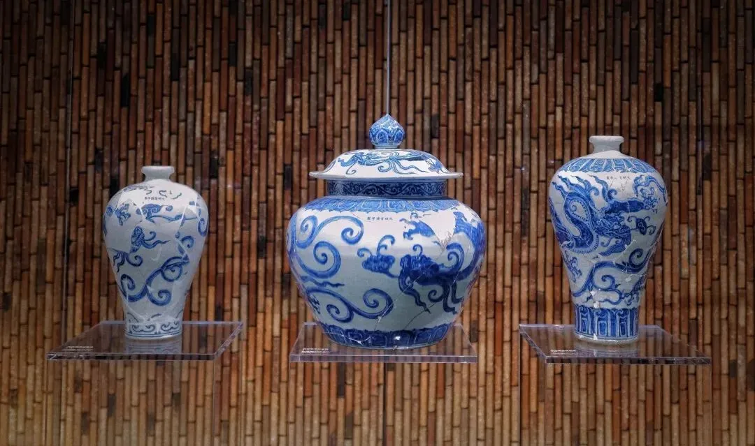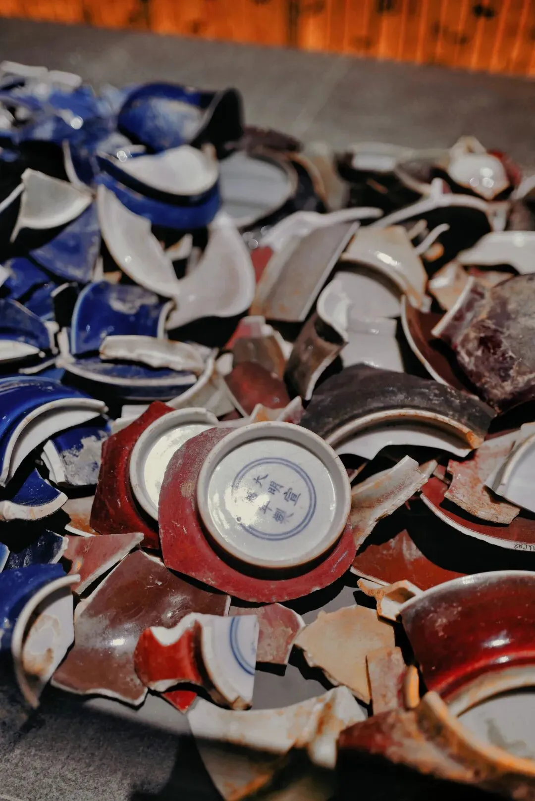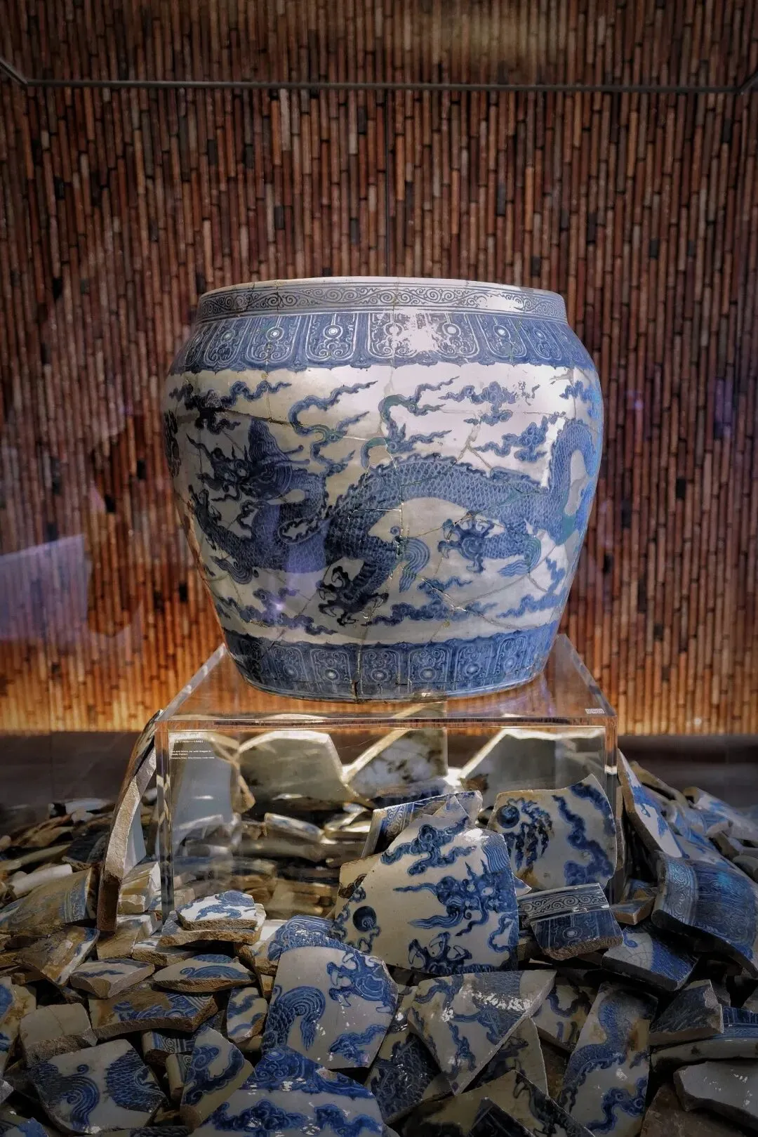 御窑博物馆旁就是曾经御窑厂的“瓷坑”所在地「龙珠阁」,精美的官窑因为统治阶级的占有欲而成为碎片,如今这些残损瓷片得以修复被置于玻璃展柜里,明代青花龙纹大缸、青花瓷枕、素三彩鸭形香薰…当年的华彩可见一斑。
