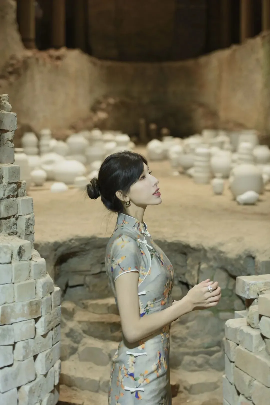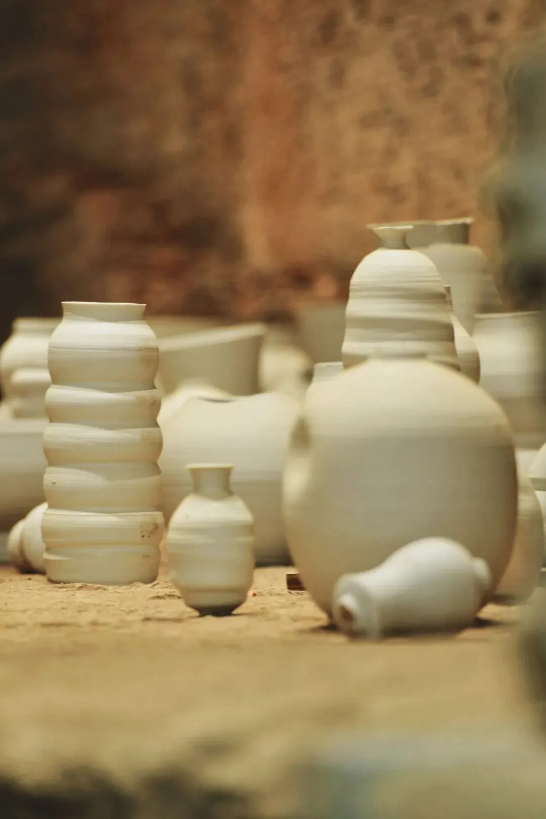 狭长的楼梯,静谧的纵深,透着微光的花格窗洞,散落在阶梯上的素胚,还有一摞摞像蒸笼似的匣钵,都是低饱和度的柔和构图。