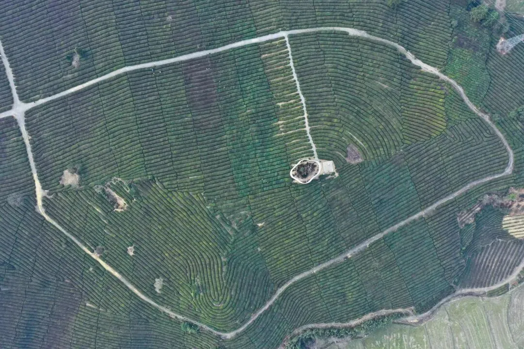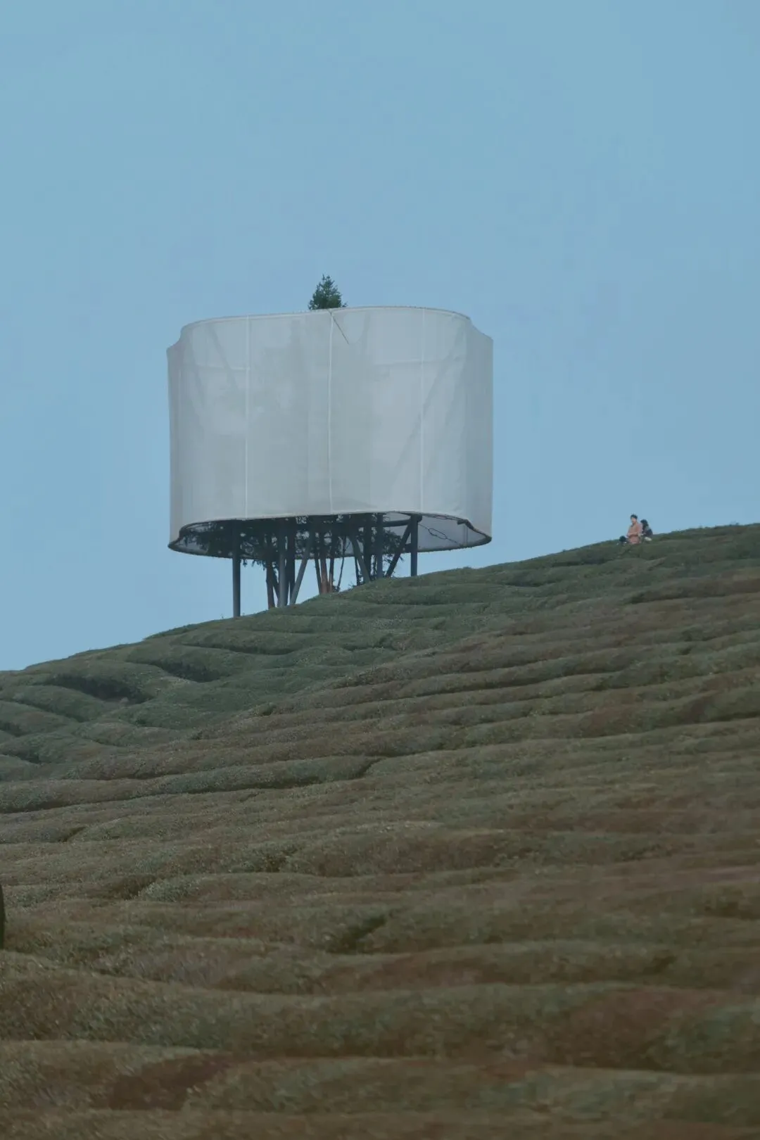 迎光时作品本体如同茶田上漂浮的白云,背光时薄膜变成半透明,成为树影和远山的取景框。从天空俯瞰绵延群山,有种大海的波浪感🌊好像是和天地对话的地方。