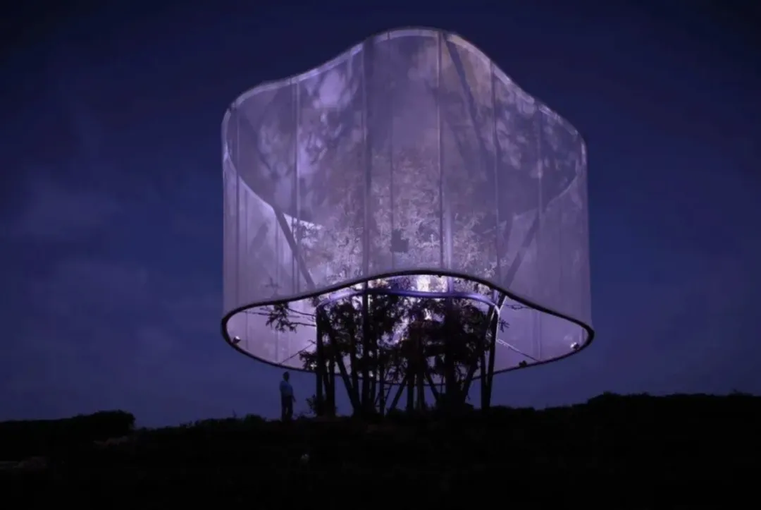 有人说这里是遮阳的亭子,也有人说长出了一个蘑菇🍄当夜幕降临,“山顶长出了一盏灯”💡四种颜色缓缓变化,遥远呼应村庄灯火。