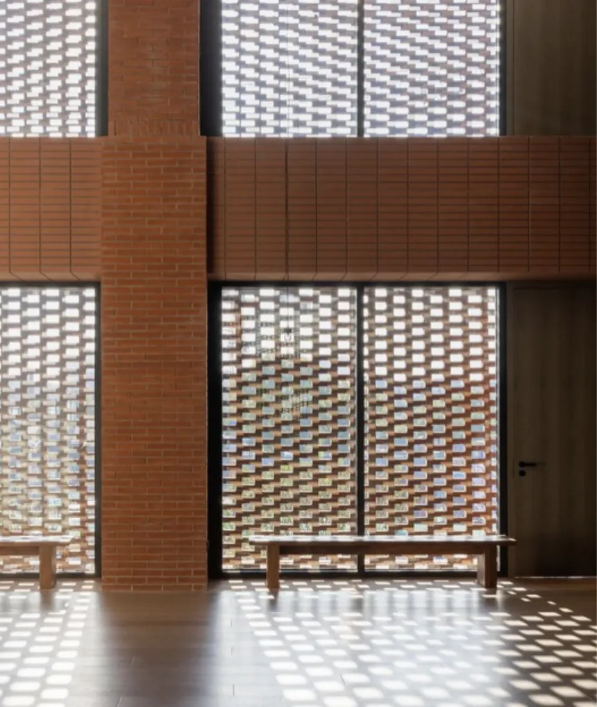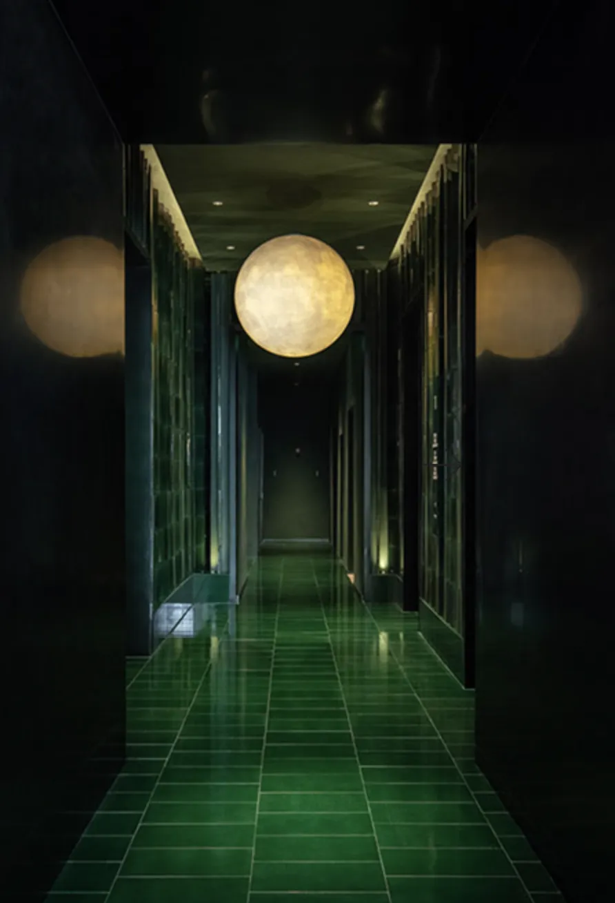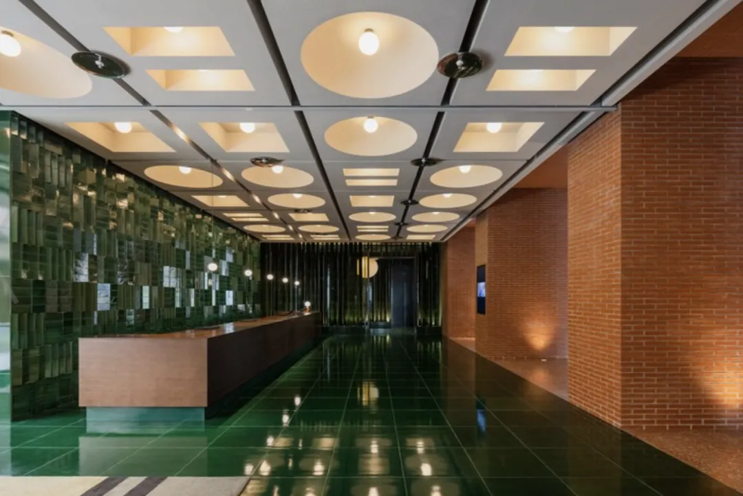 青川大堂的绿色瓷砖与红砖形成强烈对比,设计源自景德镇最经典的元素“窑炉”,只不过这个窑炉是倒置的!自然光线透过天窗光影绝美好嘛~电梯口的月球灯超出片📷