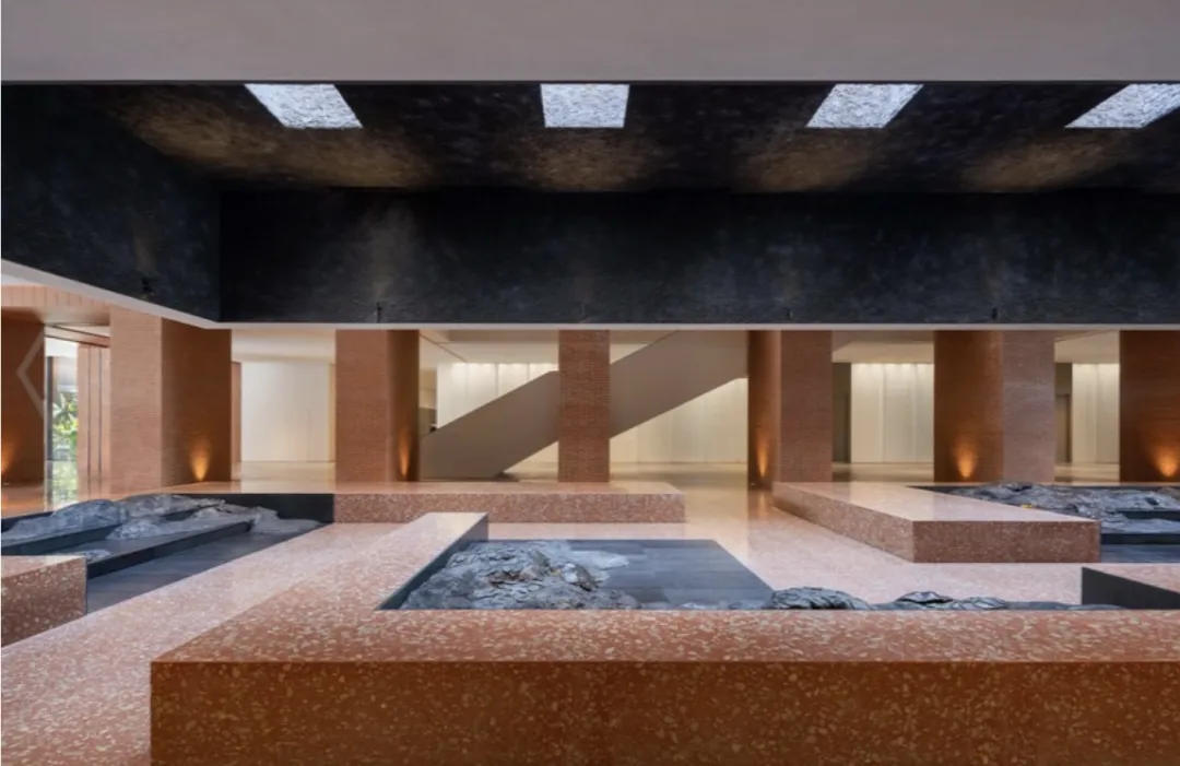整个艺术体仿佛从地下「生长」出来,与周围的水池若即若离,有实有虚,建筑的线条交错,光影重重。这些断壁残垣的老窑遗址,是薪火相传的不灭记忆,是不可切割的城市温度。