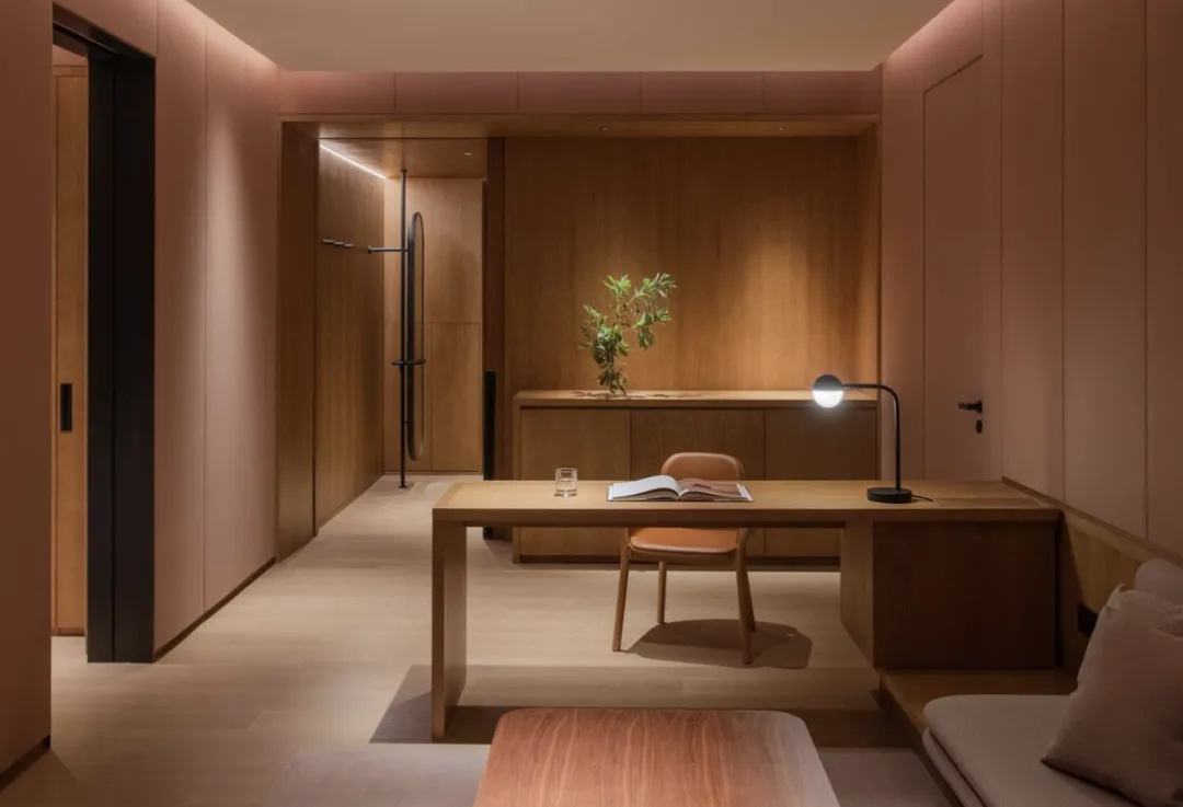 客房是少见的粘土色,这个被称为「工作室」的地方是大隐隐于市的最佳休憩处。帆布墙面、原木轻革,以及纹理质朴的长凳和衣架都让房间散发出一种温润感。