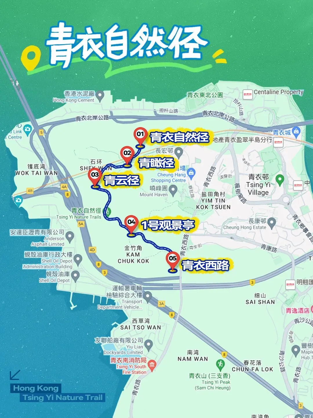 青衣自然径 — 青瞰径 — 青云径 — 1号观景亭 — 青衣西路