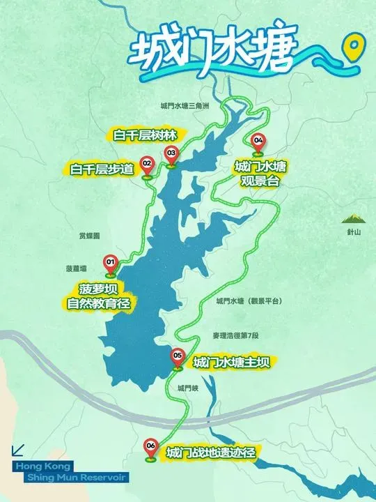 菠萝坝自然教育径 — 白千层步道 — 白千层树林 — 城门水塘观景台 — 城门水塘主坝 — 城门占地遗迹径