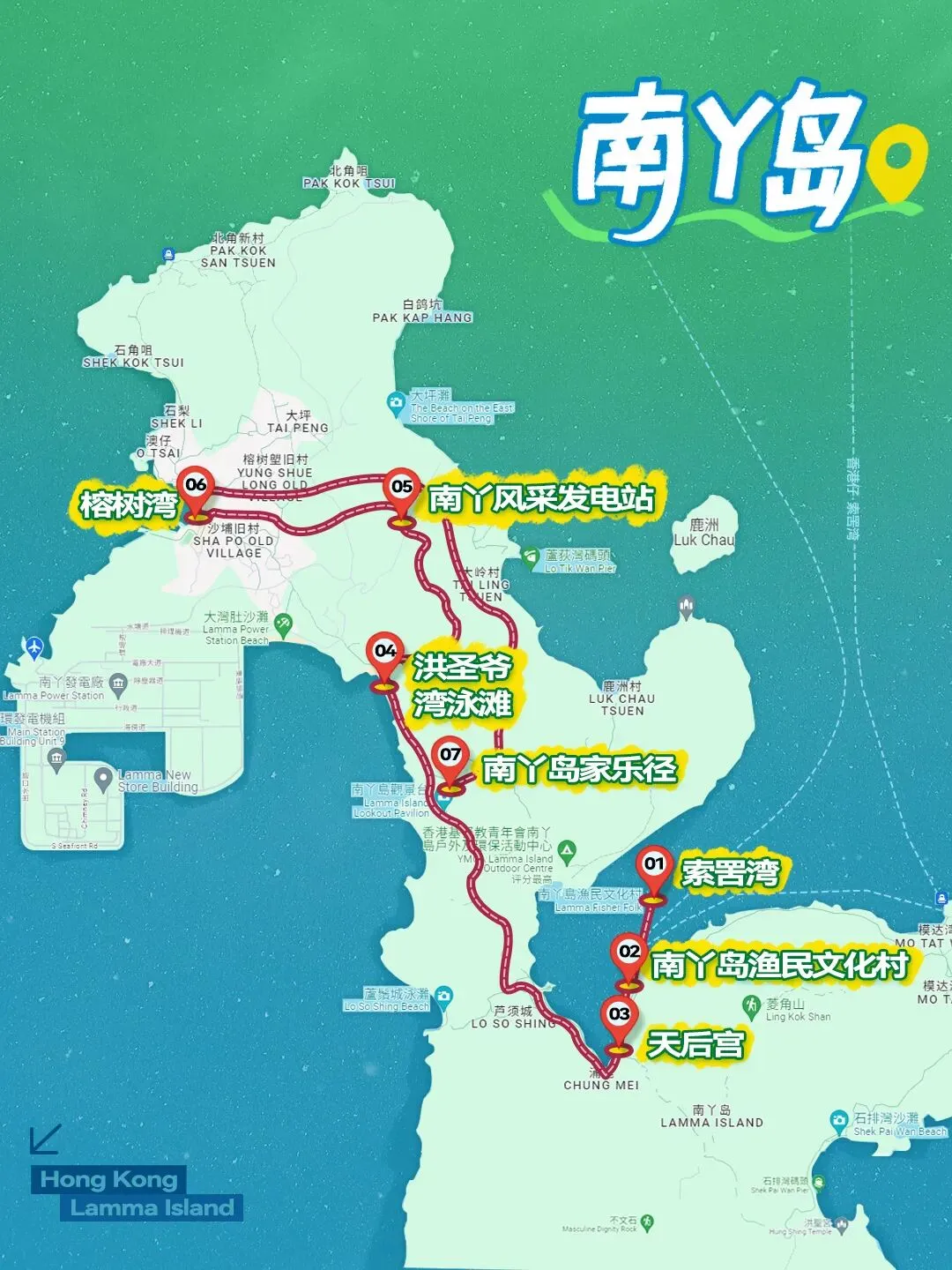 索罟湾、南丫岛渔民文化村、天后宫、洪圣爷湾泳滩、南丫风采发电站、榕树湾、南丫岛家乐径
