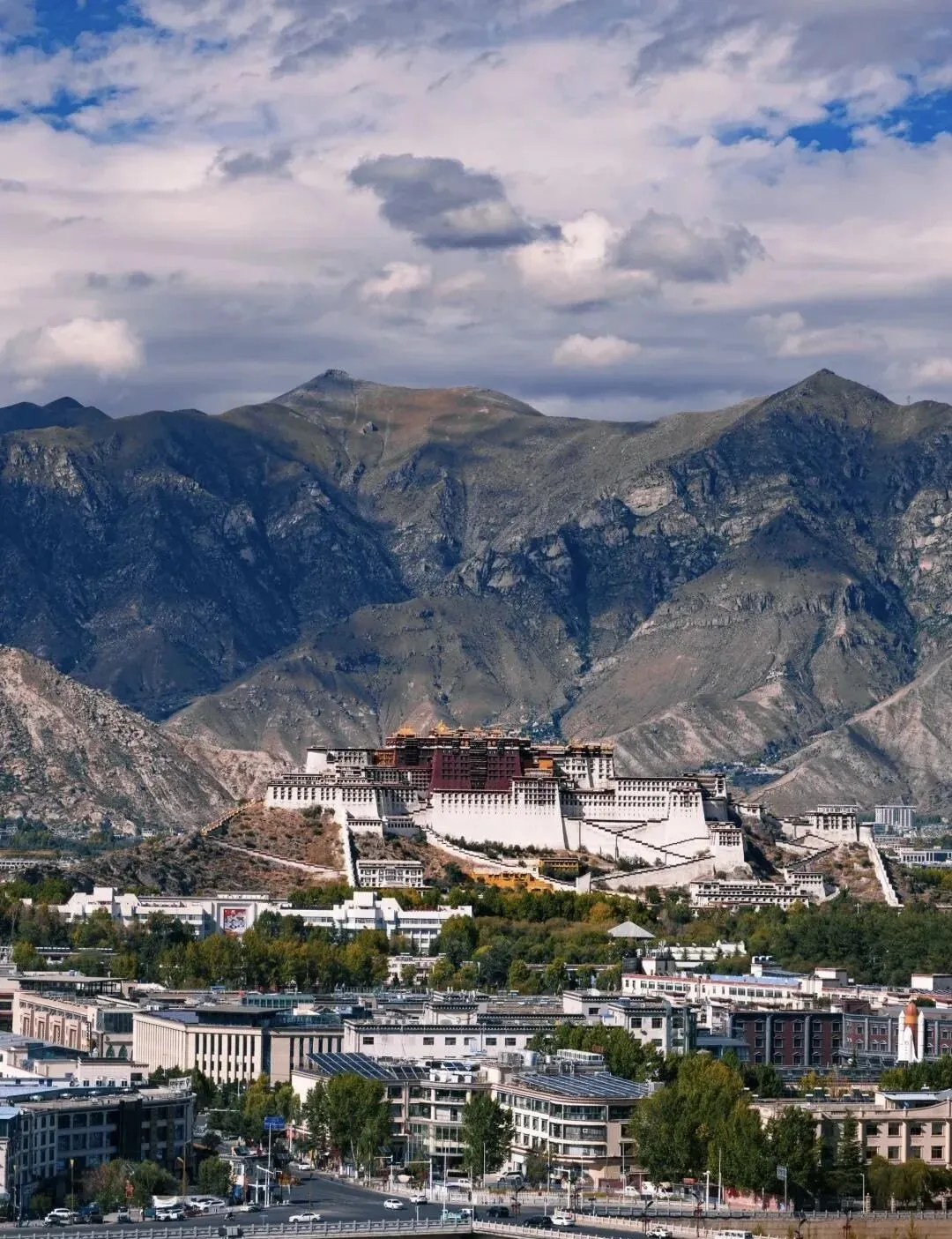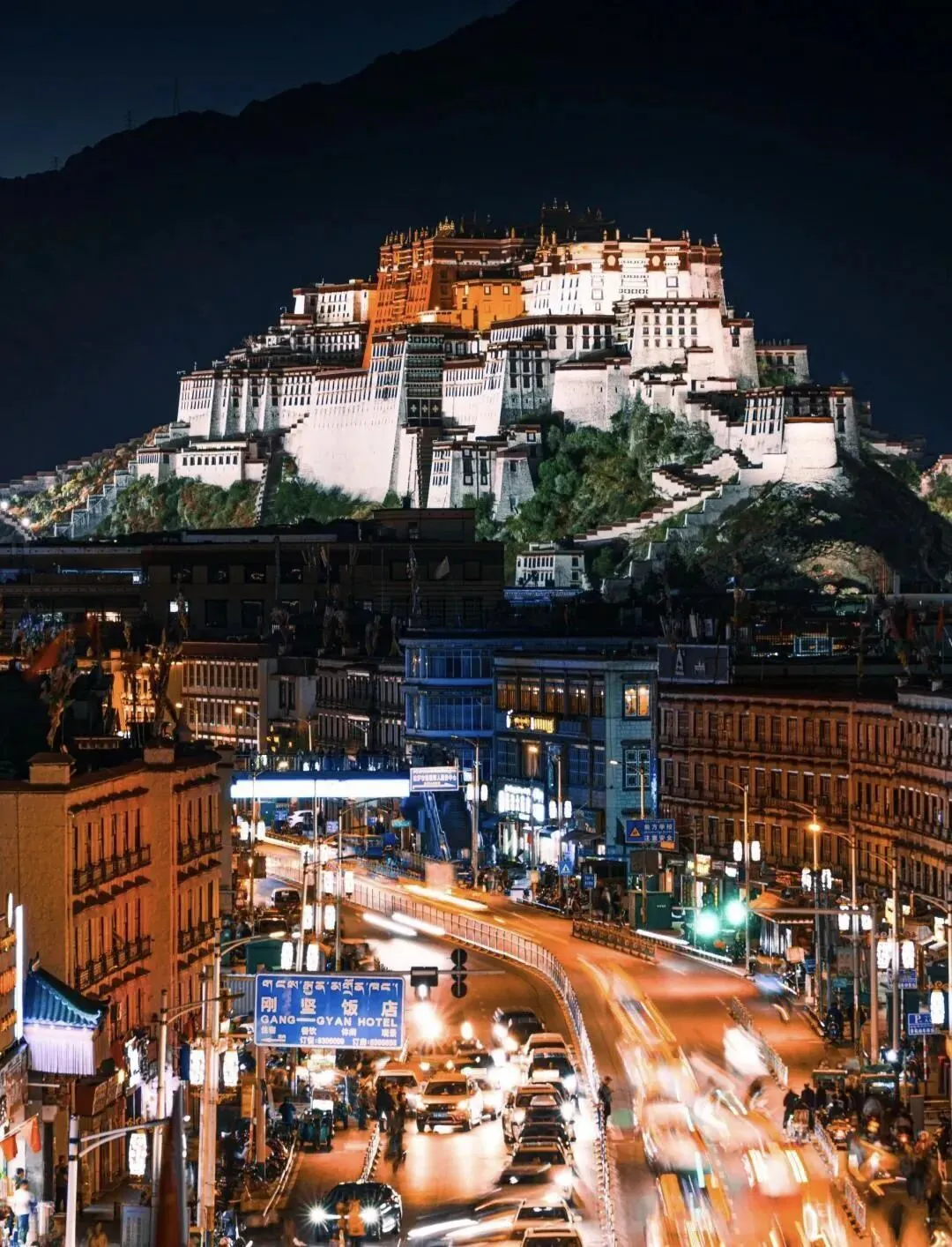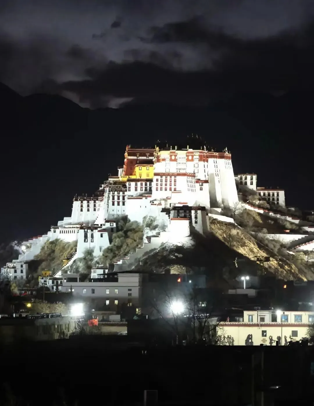 日出时,它被金光笼罩;日落时,它与晚霞同辉;夜晚灯火亮起,又温柔了整座拉萨城。