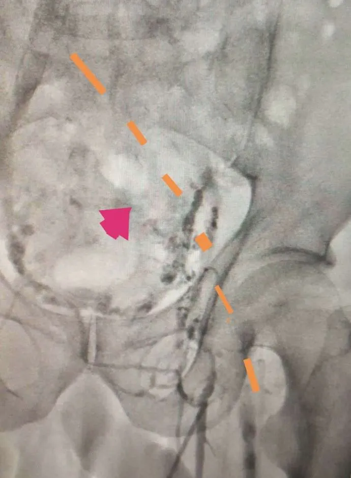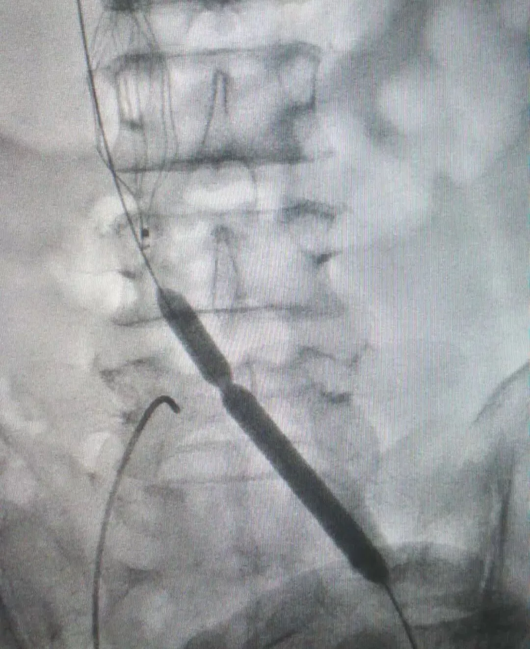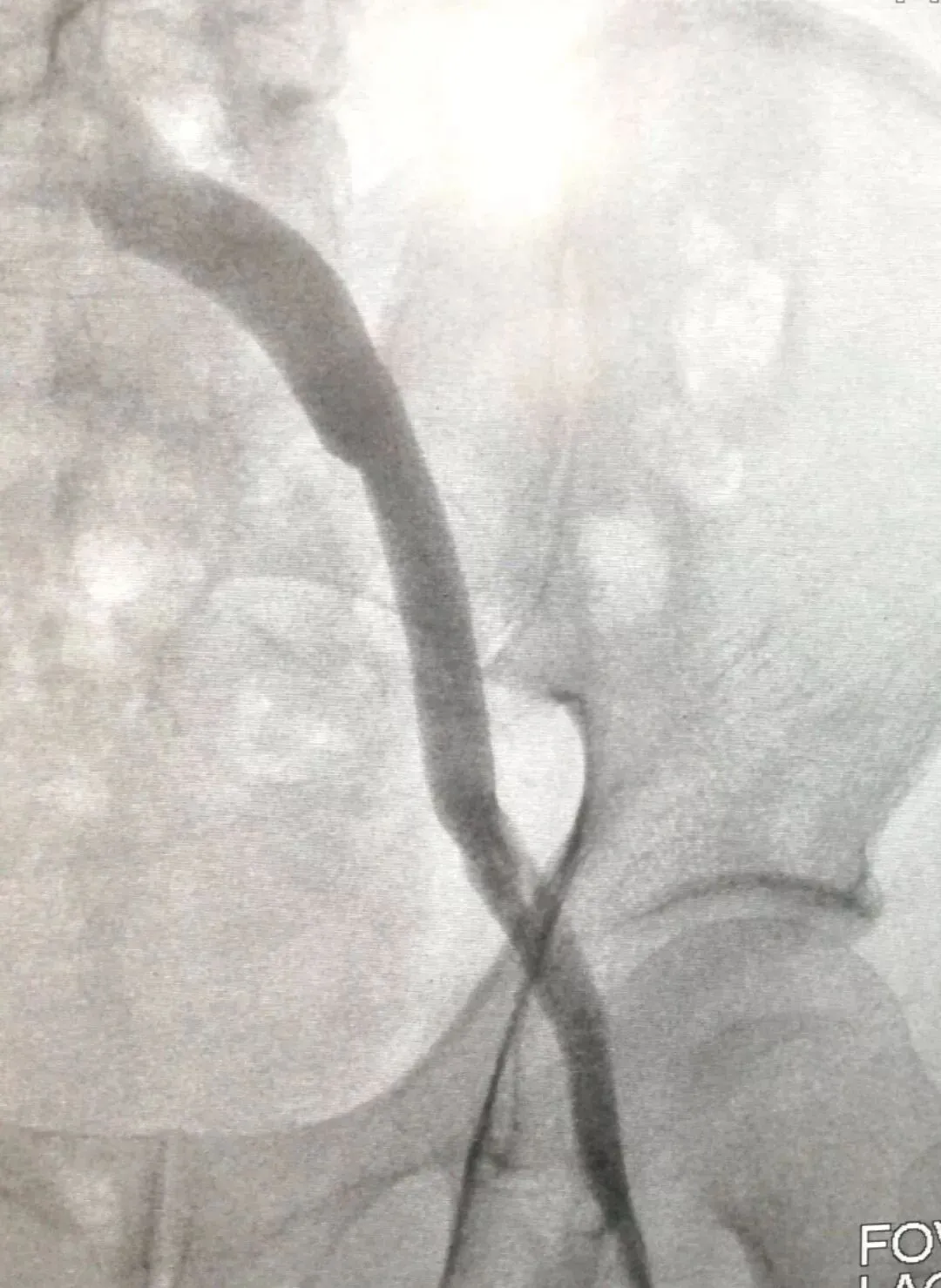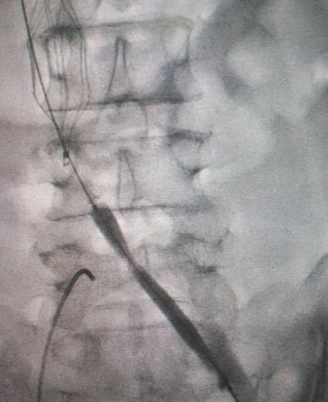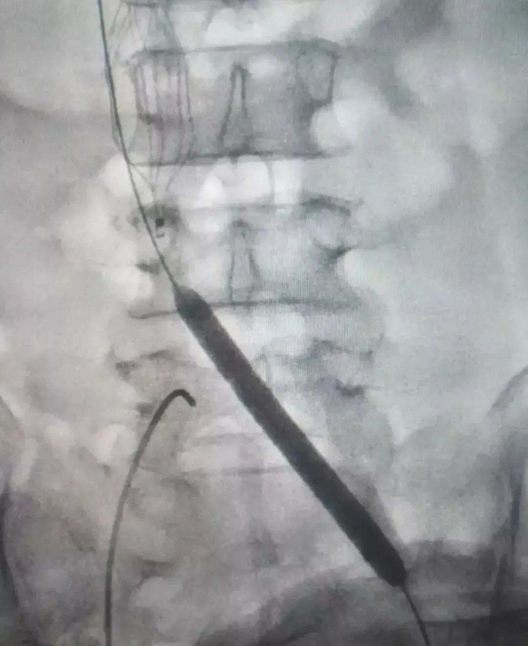 术中造影显示,王大叔左侧股静脉、髂总静脉有长段血栓形成,阻塞范围约有30cm长。由于静脉的血管壁薄,血管闭塞时间长,病变范围广,所以手术的风险极高。丛海波院长和影像科主任兼介入、血管外科负责人侯红军团队决定为其进行“左股静脉切开取栓+左髂总静脉闭塞球囊扩张术”,术中用取栓导管取出40-50毫升血栓,由于髂总静脉开口处血管质地硬,导管无法直接通过,采用导丝导管技术通过了闭塞段,并用球囊逐级扩张。