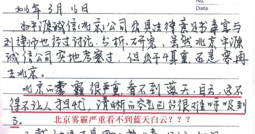 东方之光律师事务所经办律师向协会提供了几篇工作日记作为工作底稿材料,其中记录了北京的雾霾、参观天安门、国家体育馆等景点的激动心情。