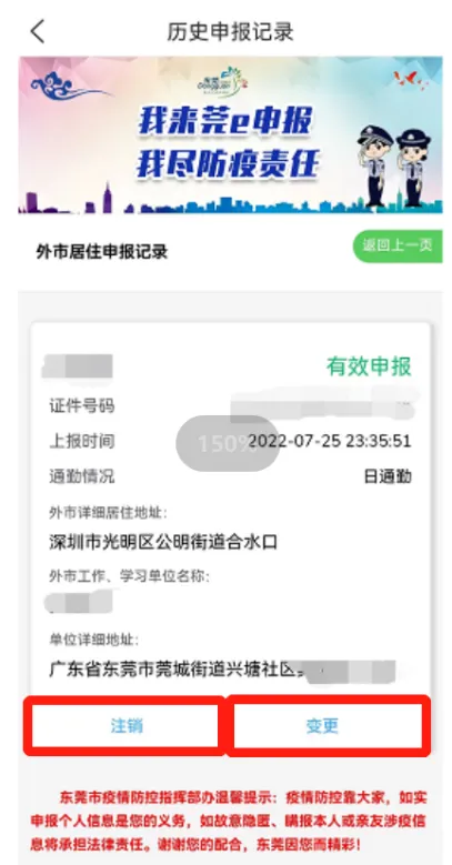 第三步:成功提交申报后,可在“历史申报记录”查看上报情况。若需修改信息可点击“变更”进行重新申报;当通勤情况结束,可点击“注销”结束通勤报备;