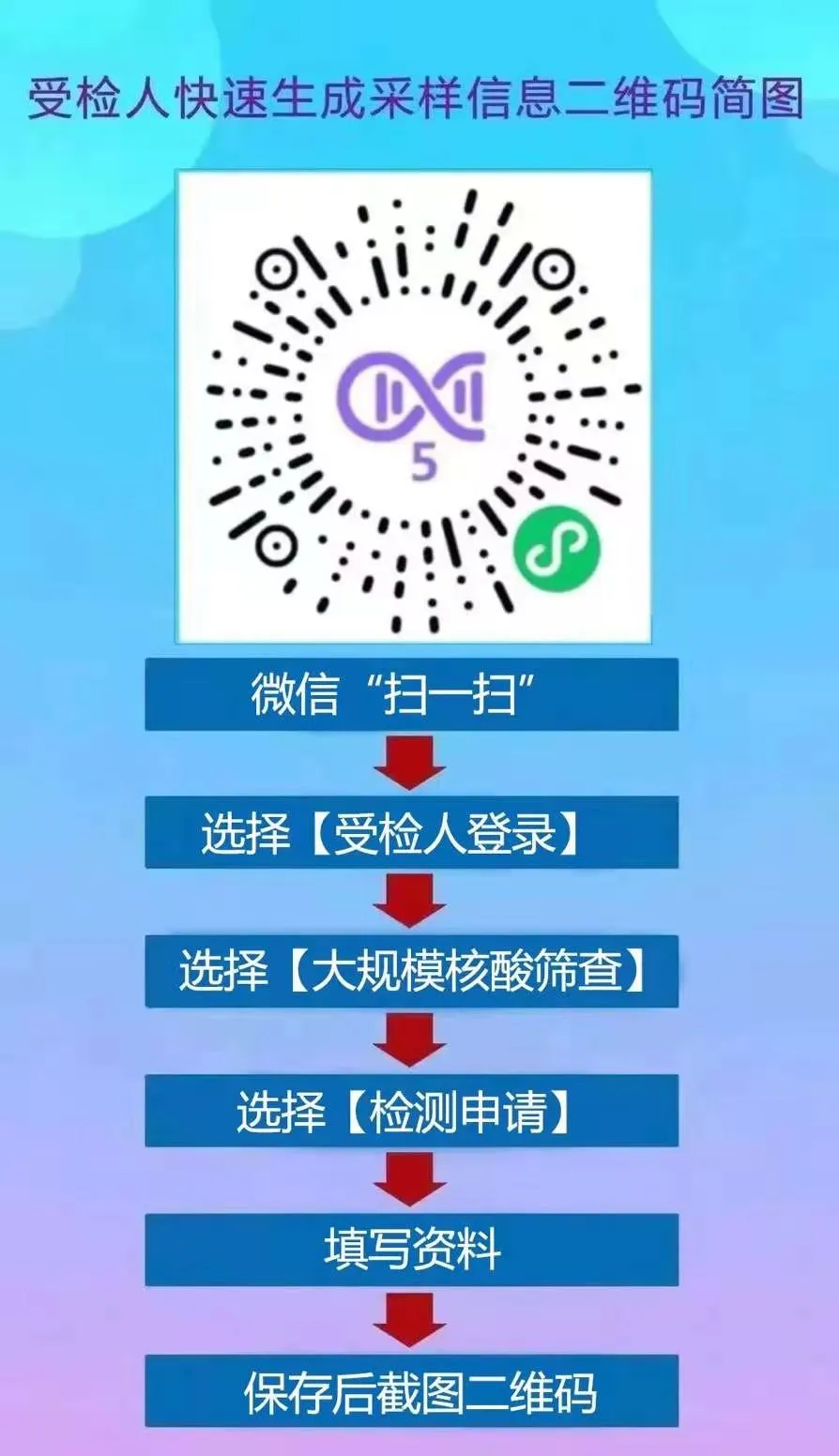 (二)前往采样点前,扫“粤核酸5”录入个人信息并截图保存二维码,减少采样现场等候时间(具体流程见下图,之前已申请的依然有效),无智能手机的市民朋友可由家人代为登记,生成二维码后截图保存,提前准备粤核酸5采样码。