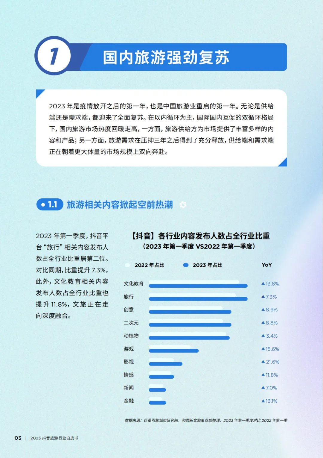 2023年,正在经历重要转折的中国旅游业,无论是供给端还是需求端,都迎来了全面复苏。我们看到,第一季度,抖音平台“旅行”相关内容发布人数占平台全行业比重第二位。超4亿旅游兴趣用户在平台观看旅游内容,用户对旅游内容的互动指标也呈现增长。 除此之外,中国居民出游意愿有所提高,微度假、跨省游等热度持续。同时,出入境政策的放开促使出入境游市场重启加速,旅游业正在进入高速回暖阶段,为拥有巨大潜力的中国出境游市场带来了憧憬。行业发展进入新时代,迭代速率加快,从需求迭代到业态迭代、运营迭代,“迭代”已成为行业关键词。 2023年,聚焦“复苏”和“迭代”两大主题,《2023抖音旅游行业白皮书》对旅游行业新特征、抖音旅游兴趣用户新需求以及旅游企业品牌传播进行深入研究,旨在洞察2023年旅游市场变革,把握行业趋势,希望能够为广大旅企及业内人士带来启发和思考。
