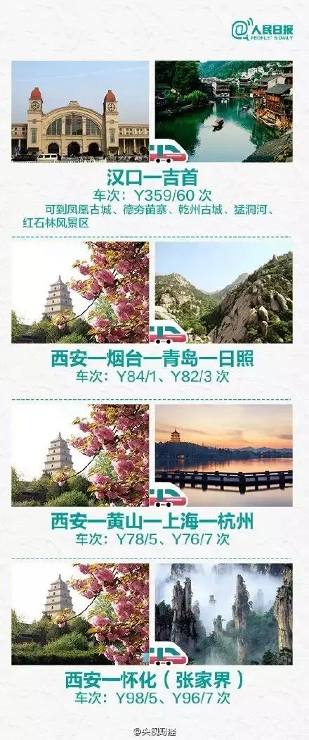 【收藏】30条最新旅游专列,一年四季说走就走!春天去江南探花,夏天到东北避暑,秋天在西北赏大漠,冬天往海南避寒,中国铁路实行近10年来最大范围的运行图调整,增开列车220.5对,其中新开旅游专列运行线30条,一年四季说走就走!你最想去哪里? 提示 铁路部门提示广大旅客,全国主要干线旅客列车车票互联网、电话订票预售期已于4月20日起恢复60天,欲准确掌握列车开行时间及时刻表,可登录中国铁路客户服务中心12306网站,以及铁路部门开通的官方微博、微信查询,或关注火车站发布的公告,以便合理安排行程。