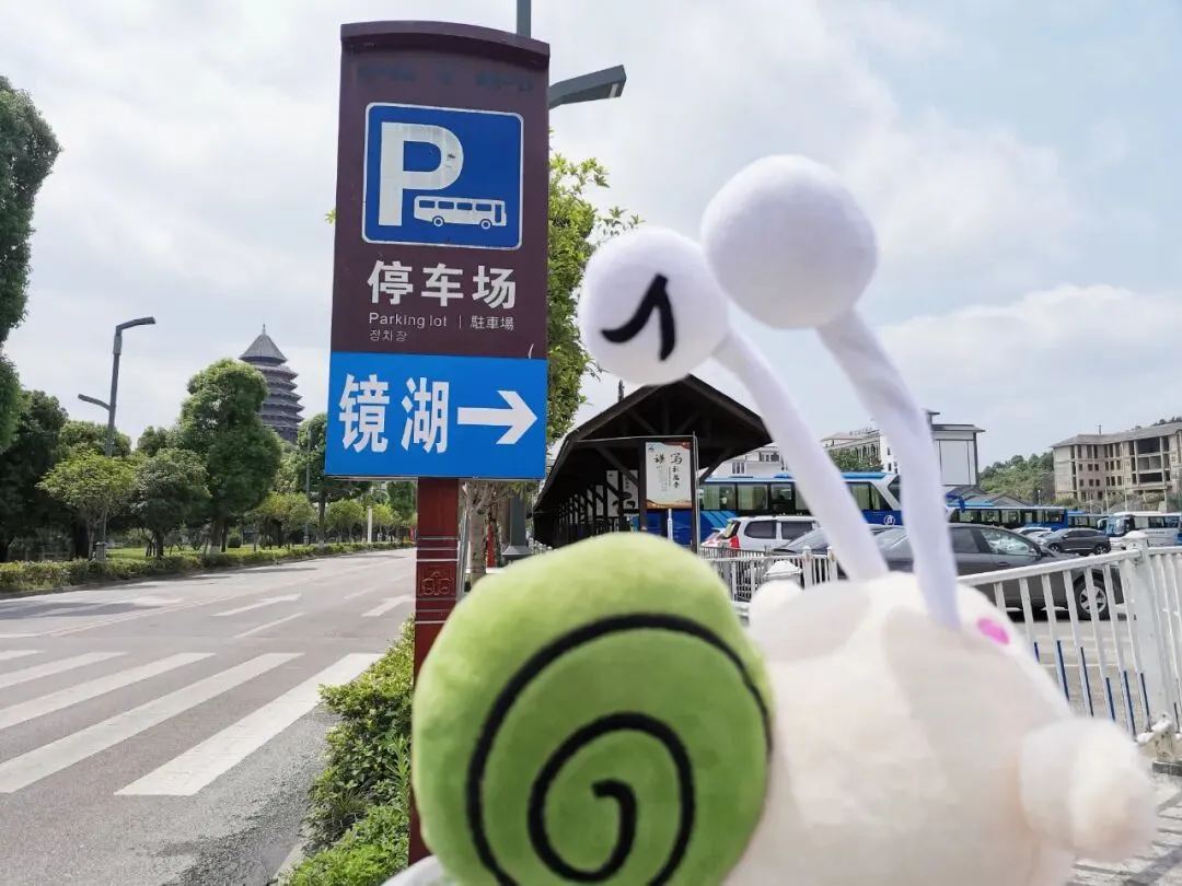 直行2分钟,看见瀑韵天城牌坊,在瀑韵天城正对面,便能看见观光车乘车点。镜湖停车场入口: