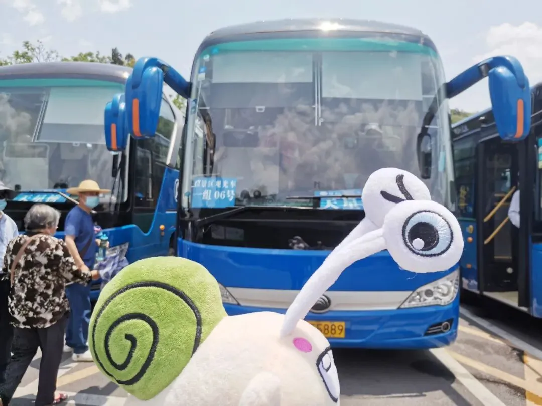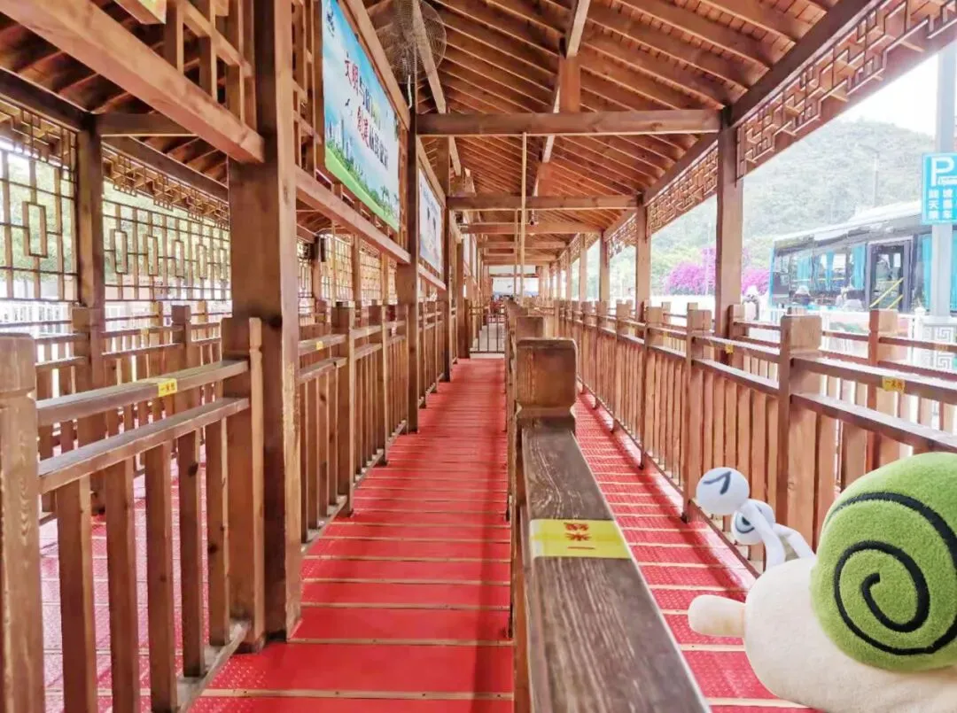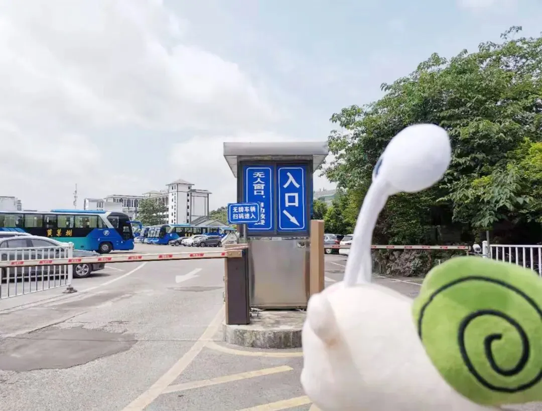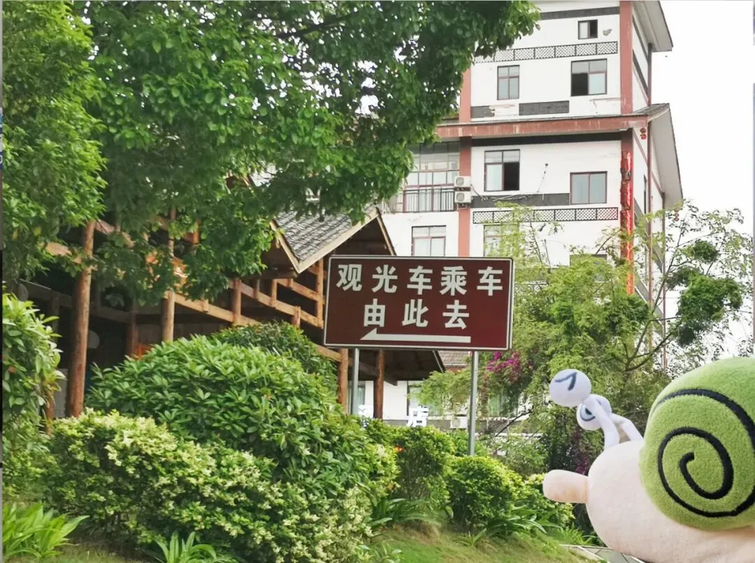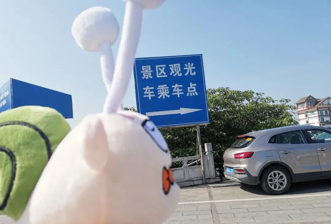 右边是观光车乘车点。蜗牛牛已提前在网上购买了门票,停好车后,我直接去了乘车点。在停车场内,能够清晰看见观光车乘车点指示牌,喇叭也随时在播放。