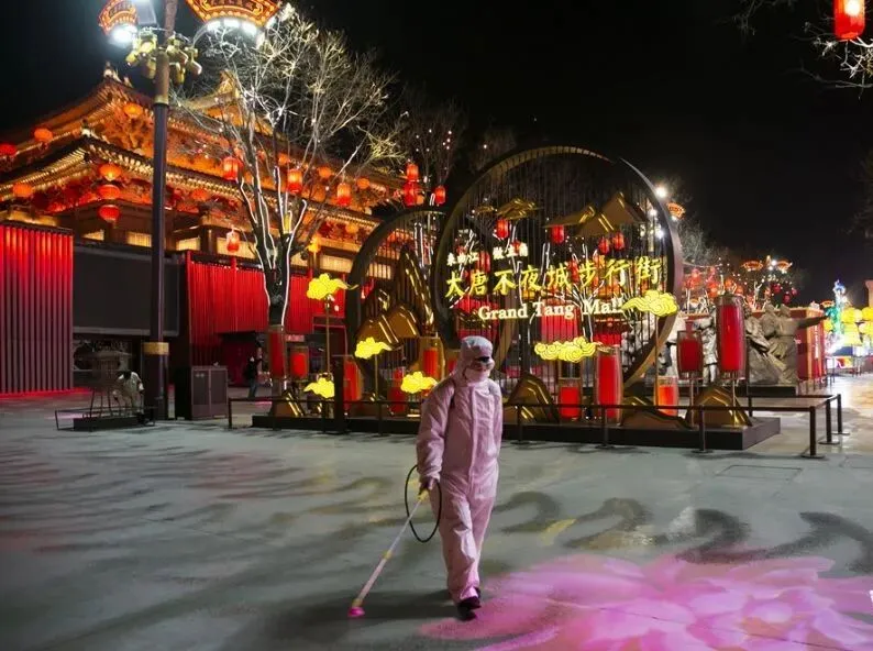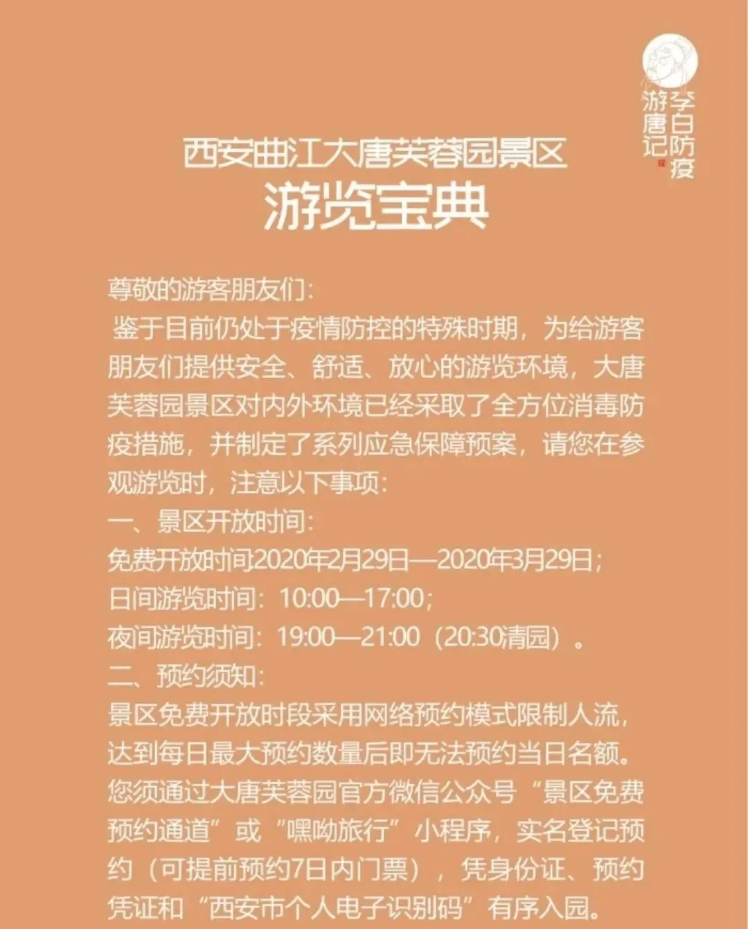 目前,园区实行线上预约和限流的防疫举措,大家可登录西安大唐芙蓉园官方微信,或搜索“嘿呦旅行”小程序预约7日内门票。预约成功后,持当日预约二维码及“西安市个人电子识别码”,经过登记核对及体温测量后,便可以入园参观。