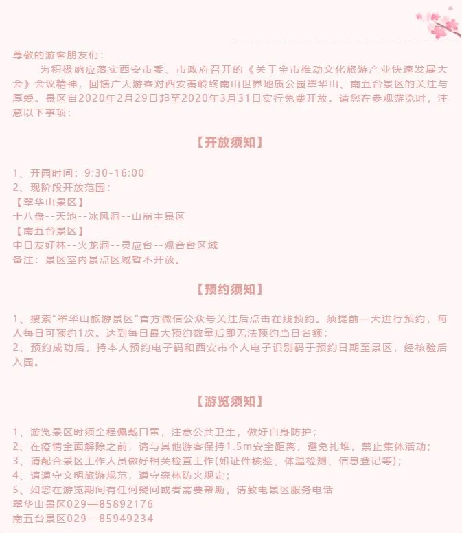南五台景区逐步有序限流开放,提前一天致电实名预约游览,入园需持本人身份证及西安市个人电子识别码,进行登记测体温,保持安全距离1.5m。开放时间:9:30-16:00。