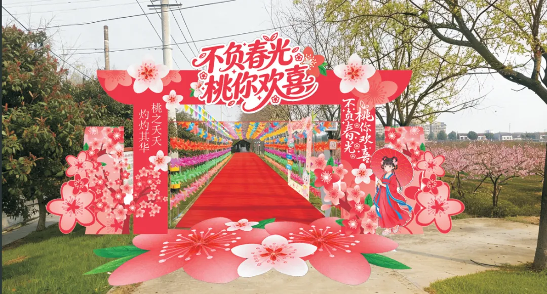 聚焦“颜值出圈、适配打卡”,新建社区打造了桃花游园季标志性打卡点——风车拱门。拱门以红色为主色调,朵朵桃花渲染主题,两侧悬挂着彩色风车,在风中轻快旋转,地面铺设花红色地毯,从拱门延伸至打卡核心区域,氛围感拉满。