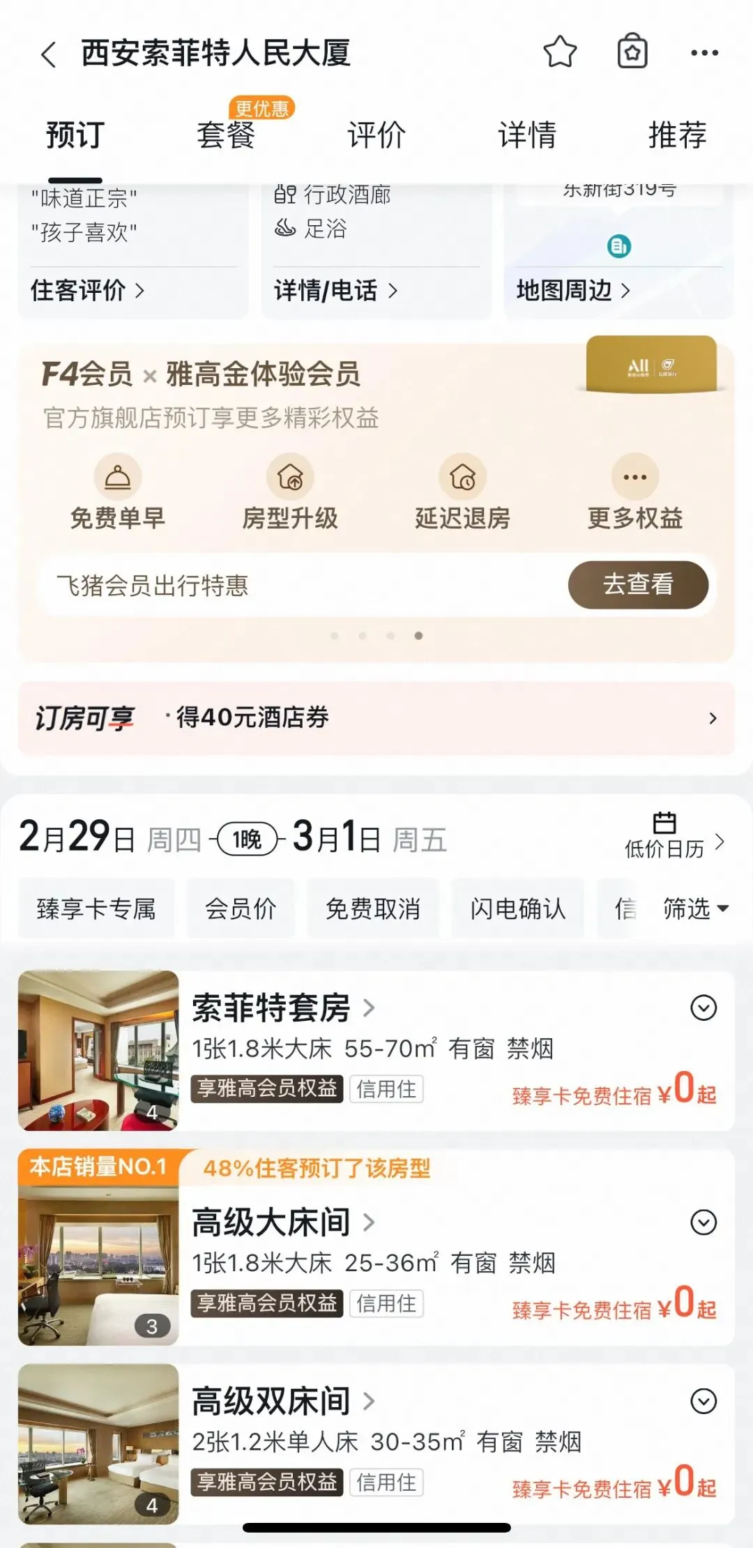 雅高的臻享卡,算是老朋友了,这次趁着寒假,又有升级! 免费房券可以直接预定套房或者行政房,预订界面有库存就能行,不是那种前台视房态升级的。