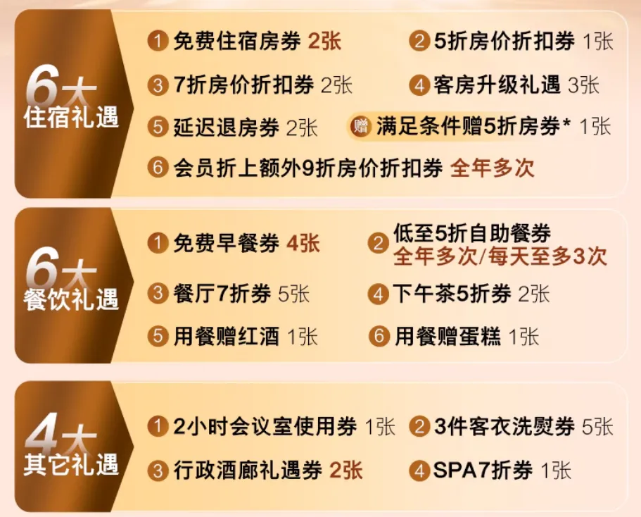 七、低至5折自助餐全年礼遇,餐厅7折礼遇*5,餐厅下午茶5折礼遇*2 低至 5 折自助餐全年礼遇:2 人及以上同行,享至多一人免单。适用参与计划酒店的全日制餐厅的早餐、午餐及晚餐时段,每天可用3次(早中晚各1次)。