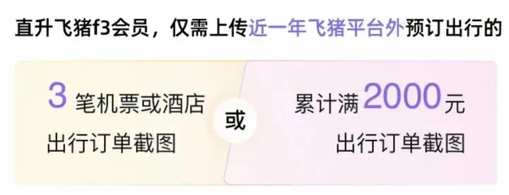 二、参与条件:当前飞猪会员等级为F1或F2的用户 三、审核通过的用户,直接发放3个月飞猪F3会员和F3会员保级1年限时挑战,同时用户可领取一份“飞猪惊喜礼包”;审核失败的用户,发放3个月飞猪F3会员限时挑战。所有挑战自任务发放后自动开启,挑战期限均为30天。 挑战或者保级很容易,只要完成一笔机票订单或者酒店订单即可(不含中国港澳台地区) 活动地址: