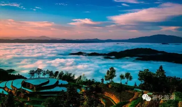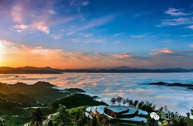 新化,山水神奇之境。因资水而水网纵横,因熔岩而山貌奇特,钟灵毓秀,旅游资源丰富,景观遍地,全县有各类旅游景点景区近300处,其中有被誉为“梯田王国”的紫鹊界秦人梯田、被誉为“人间福地”的大熊山、被誉为“世界溶洞极品”的梅山龙宫,还有“世外仙境”奉家古桃花源、黑茶鼻祖产地渠江源、“天然氧吧”三联峒、“湘中千岛湖”龙湾国家湿地公园,“江南峡谷第一漂”油溪河漂流等。