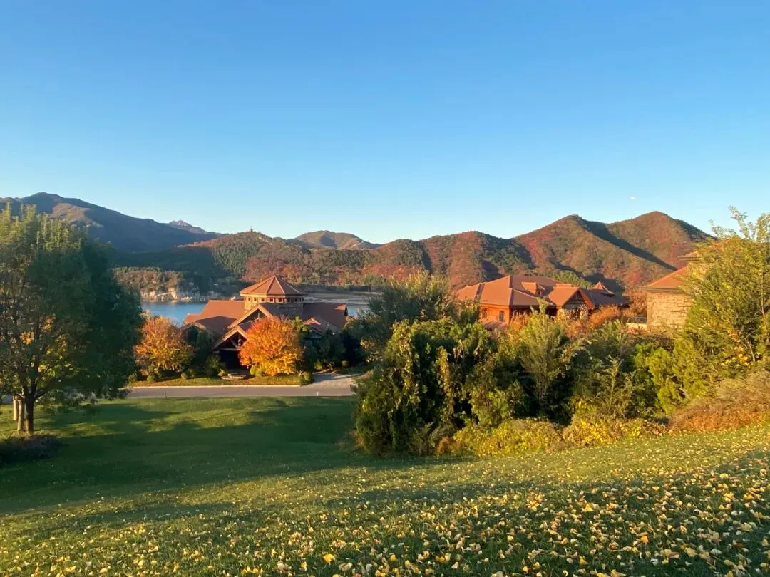 // @Maki 金海湖景区坐落在北京郊区平谷,市区开车大约2个小时左右,可游船进岛也可开车入岛,碧波岛号称京郊小瑞士,欧式风格建筑,四处环山湖水环绕斜坡大草坪,儿童乐园房车营地骑马射箭高尔夫水上运动一应俱全。