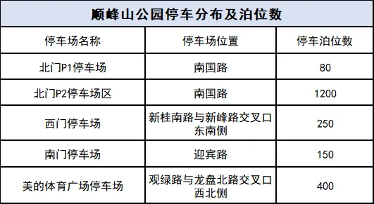 (1)顺峰山公园共开放北门停车场、西门停车场、南门停车场、美的体育广场停车场,共约2000个停车位。