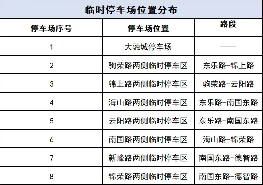 (2)五一期间新增临时停车场,开放大融城、及驹荣路、锦上路、海山路、云阳路、南国东路、新峰路、锦荣路等部分道路两侧供车辆临时停放,共约提供停车泊位约2660个