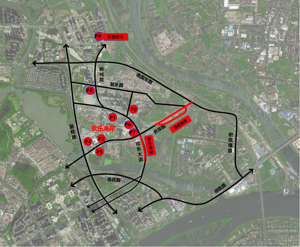 (2)停车建议:预计假期高峰时段,华侨城周边P1-P7停车场停车供应不足,停车排队预计会导致欢乐大道、乔岸路及碧桂路辅道拥堵,为避免排队停车加剧拥堵,建议游客高峰时段优先选择停车至外围P8、P9停车场,再乘坐华侨城免费接驳车或其他方式至园区