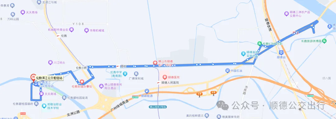 站点信息:伦教滨江公交枢纽站、大成花园、培教小学、御景坊、伦教康乐中心、伦教街道办事处、景湖公园(荔村新路)、荔村村委、荔村东街路、伦教中学、熹涌工业区、和平创伤外科医院、天乐通信、福星大道、霞石工业区、伟经厂、伟德利厂、龙洲路三洲路口、美涂士、长鹿农庄牌坊、美涂士、广珠城轨顺德站路口、三洲市场、三洲牌坊(678文化街)、新翁祐中学、伟德利厂、伟经厂、霞石工业区、福星大道、天乐通信、和平创伤外科医院、熹涌工业区、伦教中学、荔村东街路、荔村村委、景湖公园(荔村新路)、伦教街道办事处、伦教康乐中心、御景坊、培教小学、伦教滨江公交枢纽站