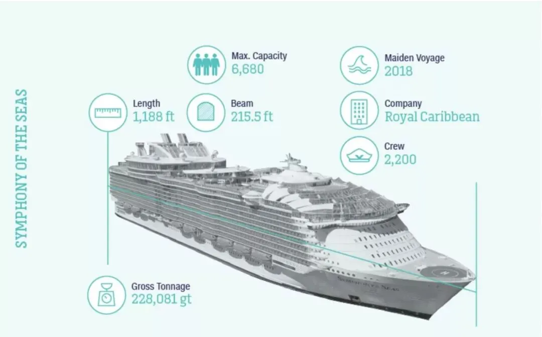 今年3月31日,一艘18层甲板的邮轮“海洋交响号”(Symphony of the Seas)在地中海开启了处女航,打破纪录成为了世界上最大的邮轮。建造成本高达13.5亿美元,重22.8万吨,长1188英尺(约362米)——几乎等于帝国大厦的高度,甚至比一艘航母还大。