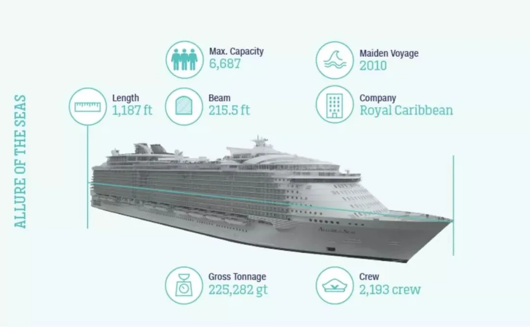 可容纳8000多人,包括2200名员工。18层甲板,其中16层是供客人使用,22个餐厅,24个泳池,2759间客房。邮轮上有缆车、溜冰场、迷你高尔夫球场、攀岩墙、带海浪模拟器的水上乐园、篮球场等娱乐场所设施,甚至还有一座种植了2万多种热带植物的公园。