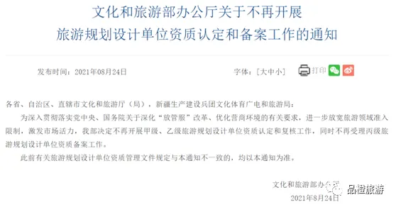 2021年8月,文化和旅游部从贯彻落实深化“放管服”改革、优化营商环境的角度,发布《文化和旅游部办公厅关于不再开展旅游规划设计单位资质认定和备案工作的通知》,决定不再开展甲级、乙级旅游规划设计单位资质认定和复核工作,同时不再受理丙级旅游规划设计单位资质备案工作。
