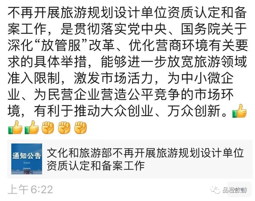 在大众创业、万众创新的背景下,此次文旅部不再对旅游规划设计单位资质认定和备案,能够进一步放宽旅游领域准入限制,激发市场活力,为中小微企业、民营企业营造公平竞争的市场环境。