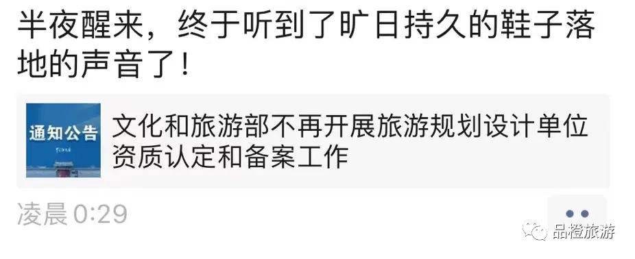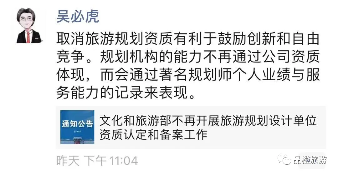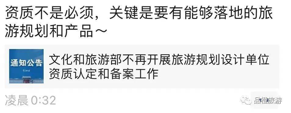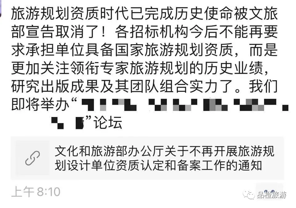 从《通知》发布后,行业反馈积极乐观,有业者欢呼“为文旅部点个赞”,他对品橙旅游表示,旅游经营本来是个市场行为,重要的是方案而不是资质,但受规定限制,政府不得不请这些有资质的机构规划设计,结果显而易见,不规划开不了工,可没有市场基因的规划,在后面的运营中却未必顺畅,花了大价钱买的规划设计本子,用也不是不用也不是,最终规划真的就变成了“鬼话”……