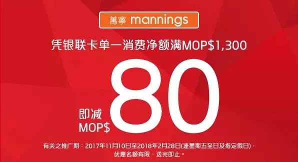 1.凭银联卡单一消费净额满MOP$1,300即减MOP$80