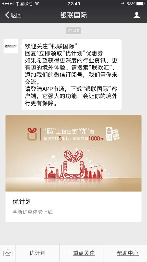 1.关注银联国际公众号,进入优计划,领取优惠券!