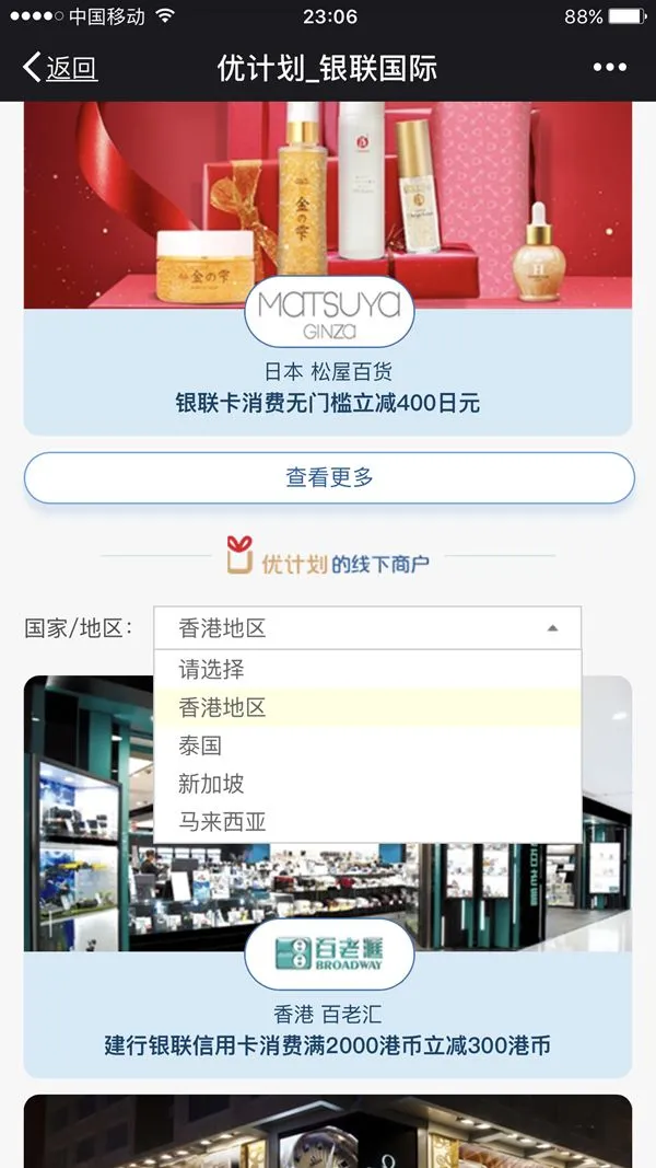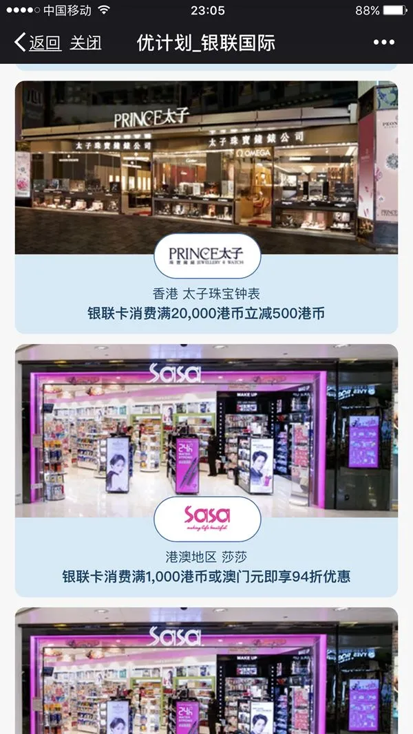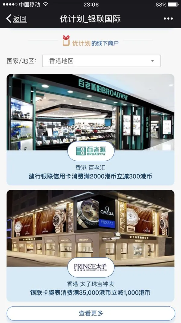 大家关注银联国际公众号,然后会看到优计划,点击进去后选择香港地区!就能看到我刚刚和你们说的那些购物门店都有优惠券可领!