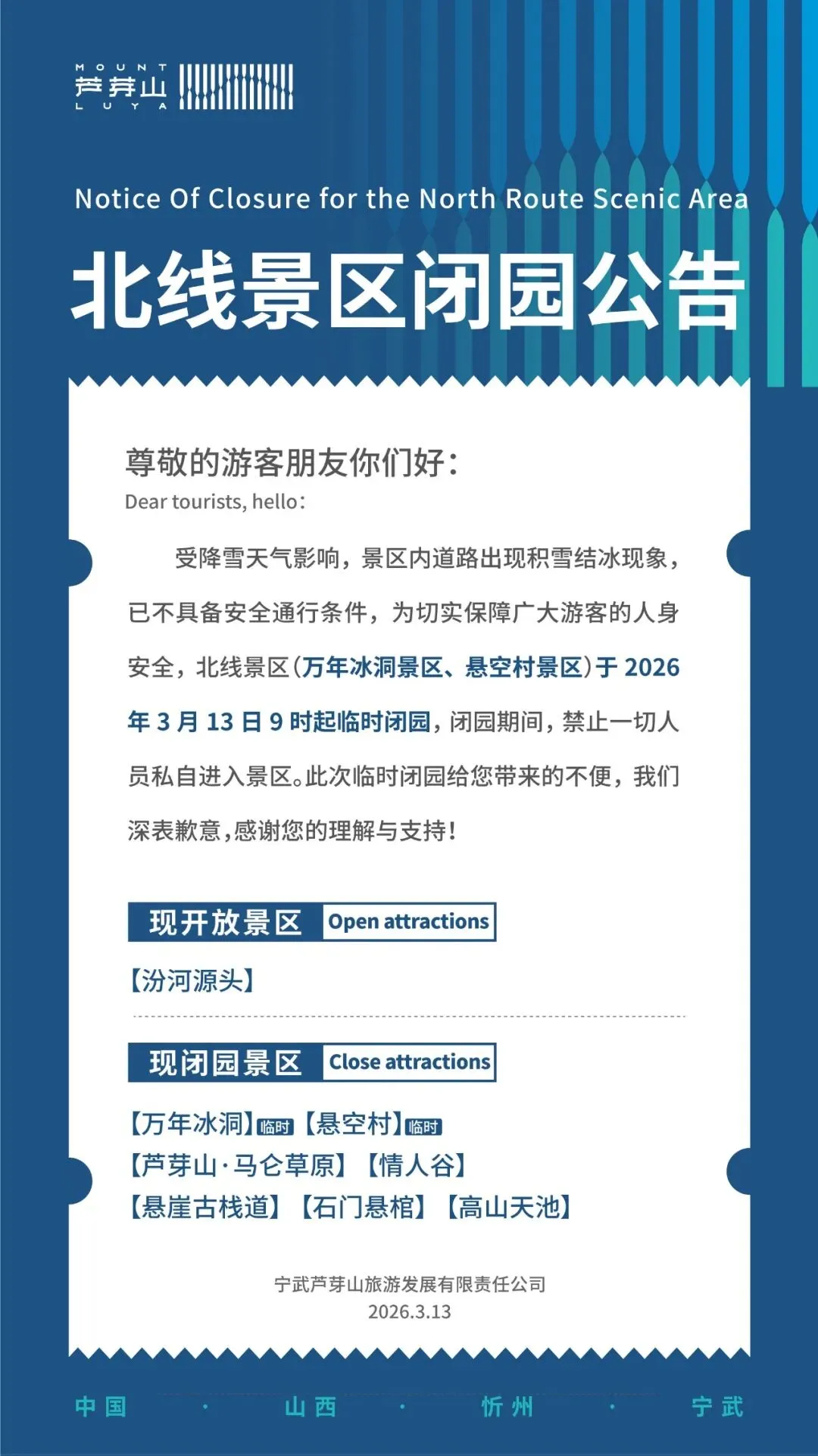 您现在的位置是:首页 > 国内旅游目的推荐 > 正文 国内旅游目的推荐 丨山西芦芽山旅游度假区丨北线景区闭园公告 admin2026年03月13日 16:09:47国内旅游目的推荐1 丨山西芦芽山旅游度假区丨北线景区闭园公告 转载请说明来源于"旅荐网",部分内容转载自网络,如有侵权请联系qlwl@foxmail.com删除 本文地址:https://www.15386.cn/post/143310.html 上一篇 强迫症的旅行指南 下一篇 【五一假期】畅游兴安盟景区攻略来啦! 相关文章 注意啦!大庆通航城市和航班起降时间微调 | 航班时刻表 关于旅行——口语素材、大作文观点——two in one, free or charge 图解:《全国红色旅游经典景区三期总体建设方案》 【五一假期】畅游兴安盟景区攻略来啦! 某湘号旅游专列豪华包厢乘务员热招啦!湖南某国际旅行社!国企直签!综合月薪8k左右,工作食宿全安排,长沙/广州始发,名额有限速来~~ 赶紧收藏!重庆周边9个赏雪胜地攻略来了! 强迫症的旅行指南 权威发布!海南省国家体育旅游示范区未来5年发展规划发布 国办最新下发的文件里,哪些内容与旅游相关? @市北人,市北最新开放景区攻略来袭!还有青岛这51家A级旅游恢复开放~ 发表评论 取消回复 评论列表 这篇文章还没有收到评论,赶紧来抢沙发吧~