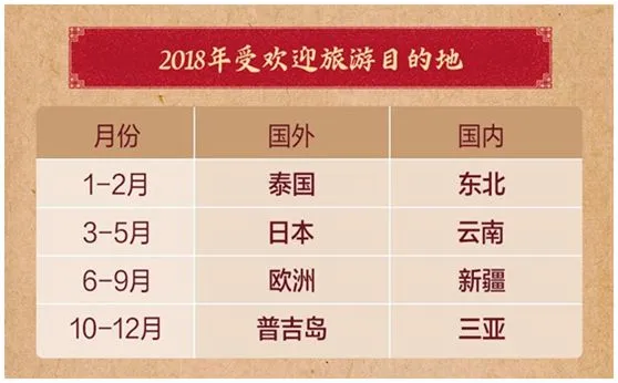 在各大目的地的行程安排上,更多人选择了去知名景点饱览美景、放松身心,知名旅游景点、乐园门票已经成为消费者线上购买旅游服务的主要内容。上海迪士尼乐园、广州长隆野生动物世界、海昌海洋世界公园及陕西兵马俑等全国知名景点纷纷上榜京东生活旅行2018年度较受欢迎旅游产品及年度评价较高旅游产品。同时,京东旅行大数据榜单也揭示了不同季节较受消费者欢迎的国内外旅游目的地,打造出一份较真实的旅游全攻略:1-2月的深冬时节,不少消费者选择去泰国“过冬”,但也有人选择到东北旅游,领略国内冰封雪飘的冬日风光;3-5月的暖春时节,人们倾向于出国日本游或是国内云南游,探寻美丽的春光;6-9月的盛夏,人们则更喜欢到欧洲或是新疆,体验不一样的异域风情;而到了10-12月的秋冬时节,人们又纷纷开启了普吉岛和三亚的阳光沙滩之旅。榜单攻略在手,在即将到来的2019年中,不妨找个空闲时间,点击京东旅行来一次放飞自我的旅行。