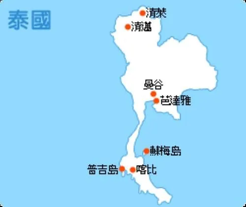 先看看泰国地图,热门的就是下图的这几个地方,但每个地方相距都挺远的,所以要确定好主要去哪一两个地方,不然整个行程就是在路上跑。