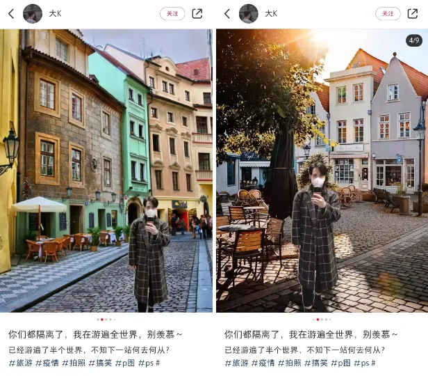 十分擅长分身瞬移大法的P图达人们,明明早上还在布拉格广场喂鸽子,中午就能赶到西西里岛听海浪。 同一个pose,一招鲜,吃遍天。