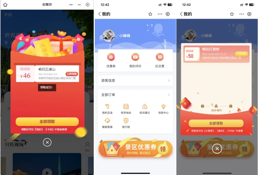 1、游客在微信和支付宝小程序搜索【徽黄游】,进入首页领取对应景区优惠券。(支付宝小程序需点击【我的】进入【景区优惠券】进行领券)