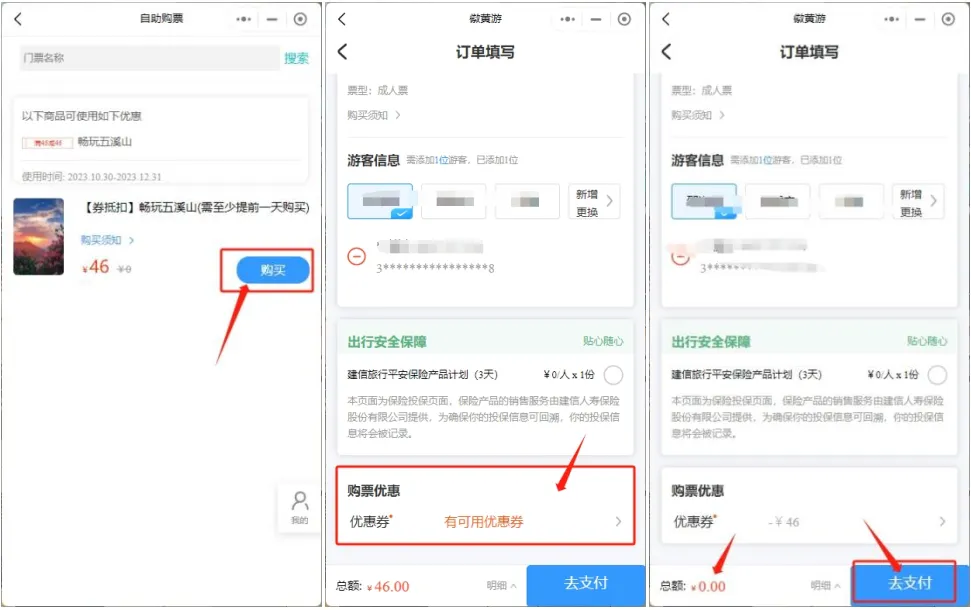 3、进入到相应景区购买页面,点击【购买】,在订单页面填写相关信息后,点击优惠券并使用,价格自动抵扣后,支付0元即可预定成功。